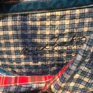 Tiedye blue casual, long-sleeve, button-down with red accent stitching and red accent cuffs. Worn only a few times. Excellent condition.