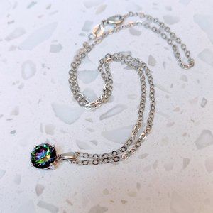 Arora Quartz Pendant with Sterling Silver Chain. This pendant has the mesmerizing dark rainbow of an oil slick. Very eye-catching. Gemstone is 9mm and the chain is 16-inches sterling silver.