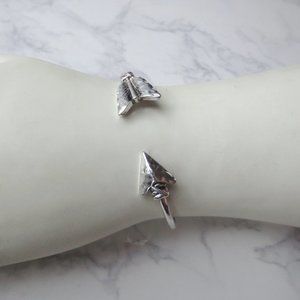Interesting design with arrowhead and feathers on either end of open bracelet