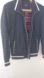 dark blue bomber jacket with a white stripe on the cuff and hem. The jacket has a full zip front and a small logo on the upper left chest.