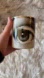 Stylish vintage looking jar/ vase/ brush holder with Eye design and gold rim. Perfect for organizing brushes or pens, holding flowers etc. New. Never used. Slight imperfections inherent to the firing and paint process and are expected. Please see photos and video.