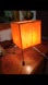 A handmade accent lamp in orange felt like fabric with bindings. Each side has a real dried leaf attached which shows when lamp is lit.