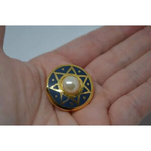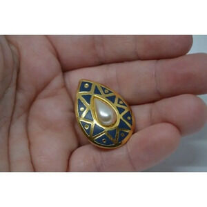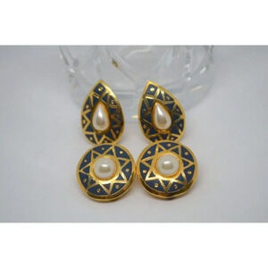 Two pairs of Duri signed clip on earrings in the same pattern with different shapes. Duri was known for geometric, Art Deco revival styles in the 1980s and these earrings represent that decade perfectly. Excellent condition, faux pearls and enamel on gold tone metal. Excellent condition, measurements in pics.
