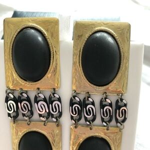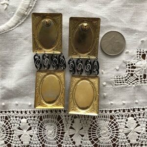 Art Deco Vintage Drop pierced Earrings. Square Gold & black lightweight
