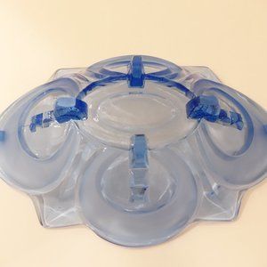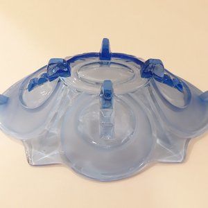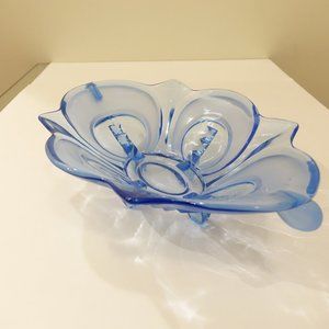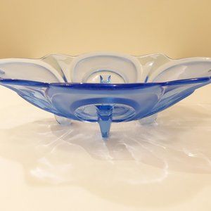 Art Deco large Blue lotus shaped pressed depression glass footed bowl 1920s