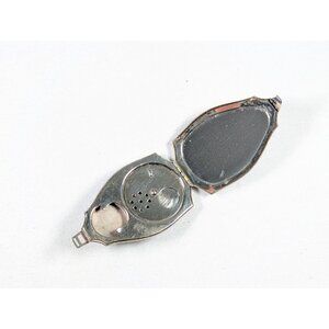 Condition: with wear to the silver toned metal finish on the outside and the edges look like they may have been gilded at some point as they appear a slight more yellow than the middle. The inside mirror with age-related tarnish. The metal around the powder space with some tarnishing - it looks like a chromed metal. It closes well with a small clip on top, the receiving end has another space for a metal or fabric ribbon bracelet handle or chatelaine chain to be attached.