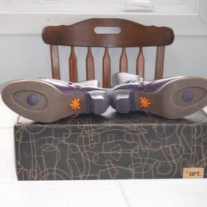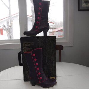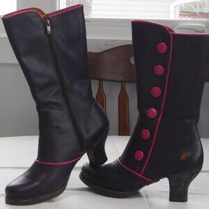 Art Gaucho Ceraza Harlem heeled leather boot in plum crazy and Fushia size EU 40. (approx US size 9) Brand New never worn. These boots have 3 inch heels and boast bold fushia piping along seams and buttons. The heel is made of rubber & died purple. These boots features the Confort Soul System and the sole is made from 100% rubber. The boots are lined in tan leather and suede and they zipper up along inside of leg. They measure 12 inches high at back & would arrive just under the calf. Very cute and fashionable I find them gorgeous! Art is the brand and they are made in Spain.