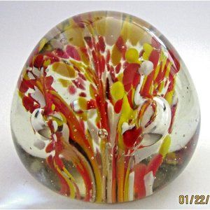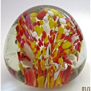 Art Glass Paperweight Dome/Egg Shape Clear & Red/Yellow with Controlled Bubbles