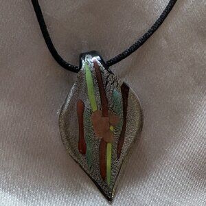 Vintage glass leaf pendant necklace, 90’s handmade glass jewelry, Artisan abstract glass statement.