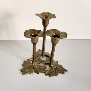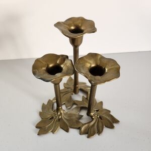 Art Nouveau Brass Candlestick Floral Leaf 3 Flame Candle Holder 1970s Frederick