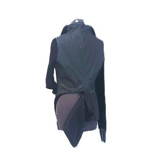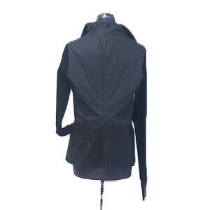 Aptly named, this jacket truly is a piece of art. Designed and made in Europe, it offers the option to create different looks. The two way zipper can create a cool, funnel neck or it can be left part way down to show a dramatic lapel. It can also be raised from the bottom to allow for comfort when sitting. The rear of the jacket can be removed at the waist for a cropped look with another two way zipper. The body of the jacket is fully lined and made of a durable, structured fabric while the sleeves are flexible interlock jersery finished with sheer, soft mesh. The mesh can be pulled down over the hand or worn as a feminine, rusched cuff. Meaurements are: PTP 17 inches (43.18 cm), waist 16 inches (40.64 cm), hip 19 inches (48.26), reg length at back 24 inches (60.96 cm), after panel removed 15 inches (38.1), sleeve 25 inches (63.5 cm), sheer cuff 4 inches (10.16 cm). This is garment you'll never tire of owning, truly a special piece to add to your closet.