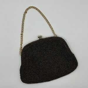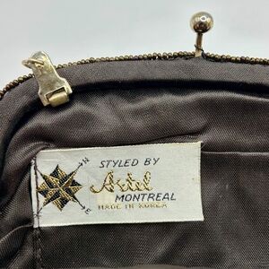 Artel Montreal, made in Korea, beaded clutch. Bronze colour with black satin lining. Gold hardware. Clasp closure. One interior pocket.