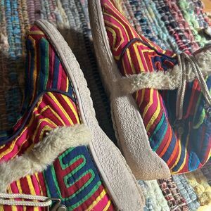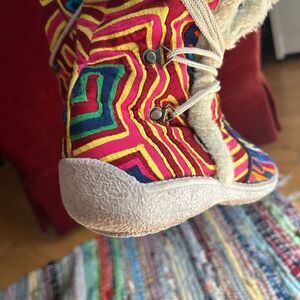 Step out in style with these vibrant, multicolored women's boots. Featuring a unique pattern and cozy lining, these boots are perfect for adding a pop of color to your outfit. Some signs of wear still in great condition. Fits 8.5 Unique beautiful.