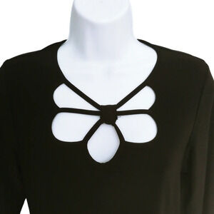 Black, stretch top. Extra long. Peekaboo flower shape in the front on the chest. Flared hemline.