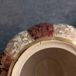 Arthur Wood Red and White Striped Porcelain Teapot with Gold Floral Design, Pattern 4278. There is significant crazing most visible on the inside and on the handle, as well as a very thin crack on one side (see pictures for all). No damage or defects noted otherwise. The backstamp dates this teapot to c. 1954. Measures 10" long, 5 1/4" wide, and 5" tall.