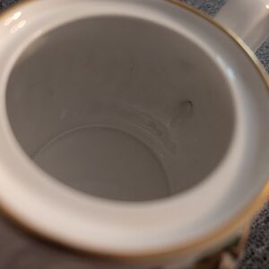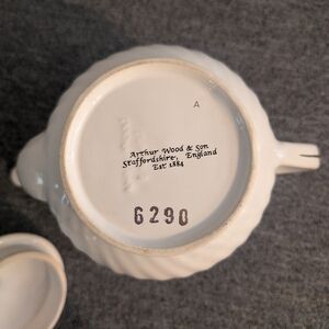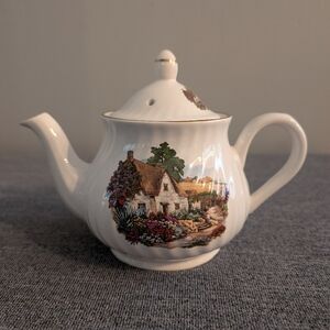 Arthur Wood & Son Staffordshire Swirled Teapot with Cottage Scene, 6290. In very good used condition, with just a small amount of tea staining on the interior that I was not able to remove while cleaning (see photos). No defects noted otherwise. Measures 7.5" long, 5" tall, 4" wide, roughly 2 cups capacity.
