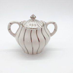 This is a sugar bowl and creamer set made by Arthur Wood and Son after 1954; I am uncertain of the exact date. They are ribbed in a swirl type pattern with silver in the swirls. The pattern number is 4489 and there are no cracks or chips though they do have crazing.
