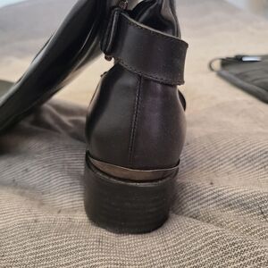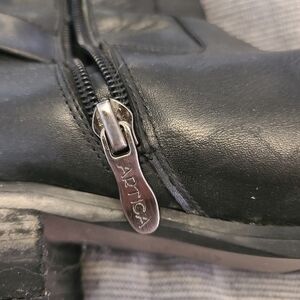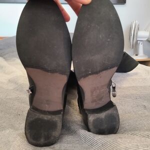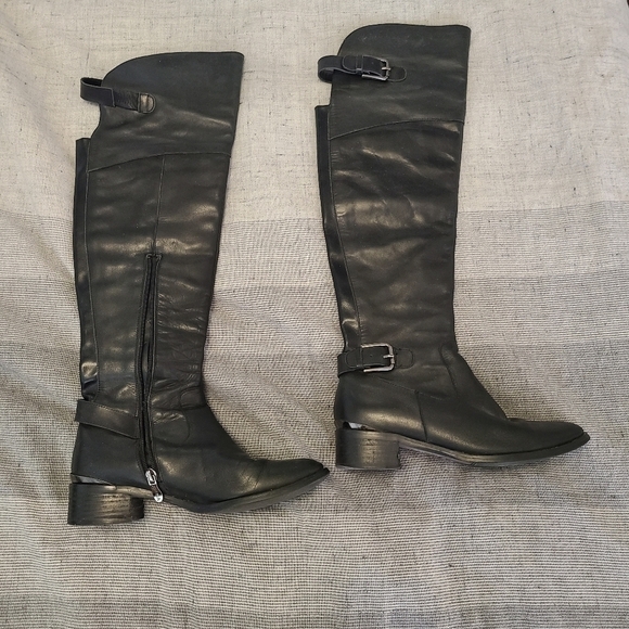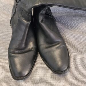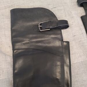 excellent condition knee high pull on boots with side zipper and buckle accent. slight creasing on the front of the boots.