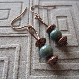 Add a touch of boho elegance to your look with these beautiful artisan handmade copper dangle earrings. Featuring earthy green-blue round beads accented by intricately detailed antique copper-tone bead caps, these earrings are lightweight, unique, and perfect for casual or dressy outfits. The fishhook ear wires make them easy and comfortable to wear all day.