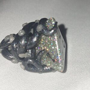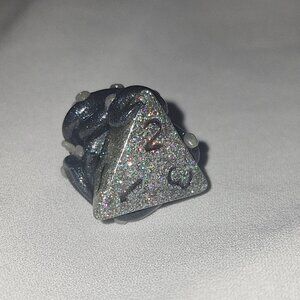 Artisan made Dungeons and Dragons inspired pendant with a handmade silver holographic sparkle d4 dice with sculpted sparkly black polymer clay tentacles and a silver spring ring to reinforce the gap for a chain or cord.