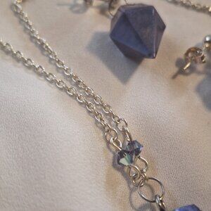 Artisan made necklace and earring set with handmade acrylic resin gem shape charms with sparkly dark purple mica glitter with a blue pearl finish accented with purple aurora borealis glass crystals on a silver tone chain.