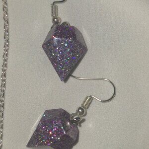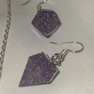 Artisan made necklace and earring set with handmade acrylic resin gem shape charms with tons of purple holographic glitter accented with purple aurora borealis glass crystal on a silver tone chain.