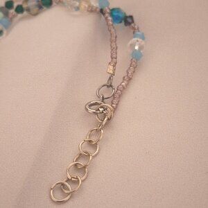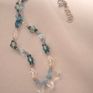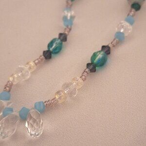 Artisan made necklace with green-blue, clear, emerald green, dark grey, and grey aurora borealis faceted crystal beads of various shapes and sizes along with iridescent clear glass and opaque light blue beads with soft lilac glass seed beads.