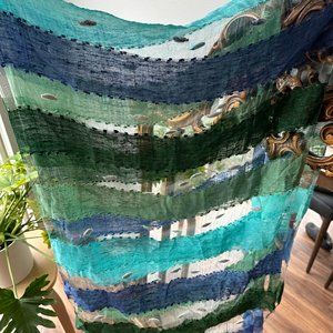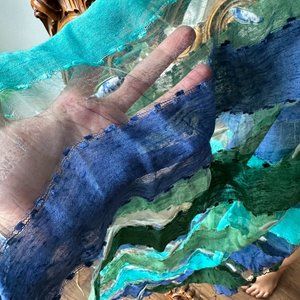 Beautiful artisan silk scarf. Delicate weave in blue, green and white / clear. Truly unique piece. Quality craftsmanship.