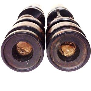 This is a unique set of two vintage African folk art ironwood (ebony wood) figural formed candle holder carvings from Tanzania, carved and etched with male and female heads on each holder. Ebony is an exceptionally hard and dense beautiful black wood found in East Africa. Talented artisans use this wood to make carvings in traditional, contemporary, and functional styles. These candle stands have the same tribal theme and are in different shades of the natural solid dark wood. Measuring 10.25" tall and 2.25" in diameter, weighing just under 1 pound each, both are in good condition, and the wear is consistent with their age and use.