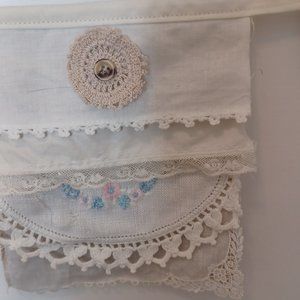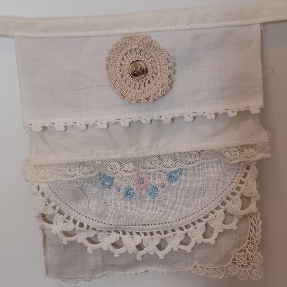 In good, clean condition. Delicate fabric. The burlap is unfinished at the edges and has had a few loose threads.