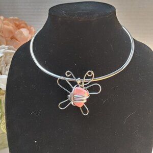 Artistic Enamel Hoop Necklace & Wrapped Pink Gemstone Pendant Butterfly