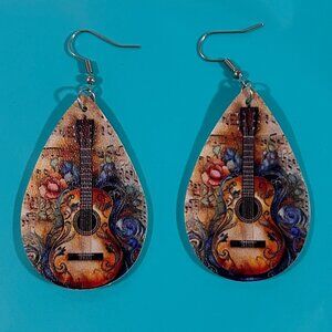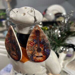 These artistic earrings feature a vibrant guitar (blue) design, perfect for music lovers. The earrings showcase a blend of warm colors, adding a unique touch to any outfit.