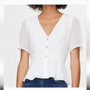 This is a semi-sheer blouse with princess sleeves and a soft peplum. It's made with billowy, chiffon-style fabric.