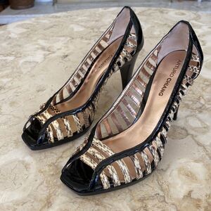 In excellent preowned condition gorgeous Arturo Chiang heels, featuring snakeskin embossed leather and black patent leather, peep toe, 3.5” heels and a slight platform.