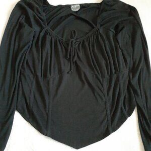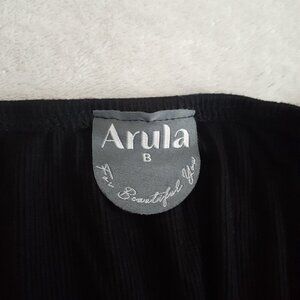 Arula women's peasant-style top in size B (vanity sizing, equivalent to a 2X). Black ribbed material with stretch. Features long puff sleeves, a square neck with elastic and front tie, and a soft corset-style ribbed front. Handkerchief hem with a shorter length on the sides. Good used condition with slight signs of wear.