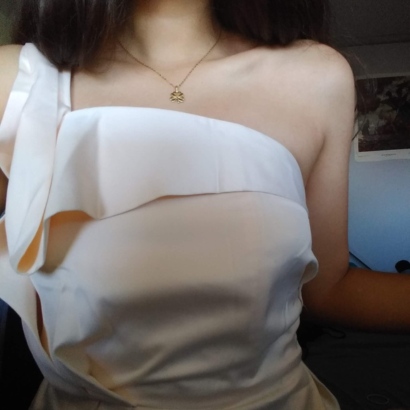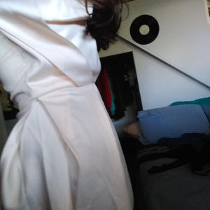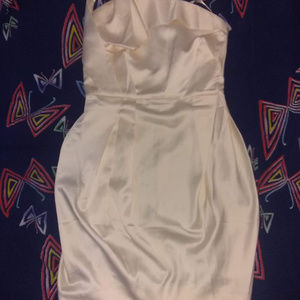 This dress is an exquisite addition to your closet; it is a soft cream coloured satin halter strap mini dress with delicate pleats that give the dress an elegant twist that is perfect for anything. It has only been used once before so it is perfect condition.