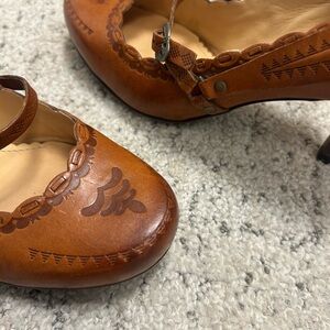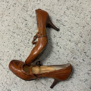 Ash 7.5 perfect barely work condition brown heels feature a classic vintage-inspired design with a rounded toe and a secure strap for added comfort. The medium-height heel offers a perfect balance of style and wearability, making them ideal for both casual and dressier occasions. The distressed leather finish adds character and a touch of timeless elegance.