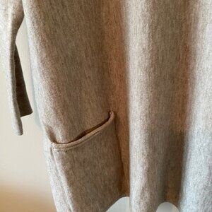 Ash Antler Boutique – dark Beige Sweater NWOT Size M/L - 2 front pockets - box style design - dropped shoulder , lightly ribbed hem and on the sleeve, viscose/nylon/polyester blend, round neckline – soft light wool knit feel - measurements from under the arms - 25” across chest – 18” side length – 28” back length from neck to hemline - front from neck to hemline 25.5” – 12.5” sleeve length - smoke/pet free home - $12