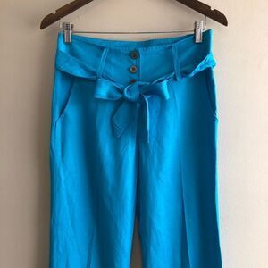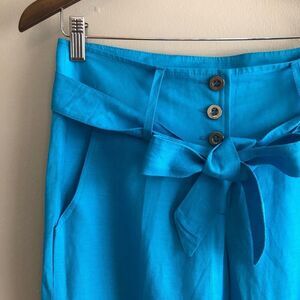 Ash / Ashanti vintage retro style high rise waist with attached ribbon belt tie at waist / wide leg fit trousers pants bottoms. Soft and comfy lino and rayon blend. Blue in colour. Marked as size 38 - waist measures at 30” so listed as such. Great gently pre loved condition / EUC. Approx measurements waist: 30“ length: 43“ inseam: 33.5“ rise: 10.5“ Offers welcome. Ships in 1-2 business days.