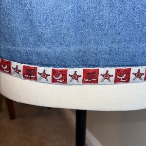 This sleeveless Ash denim top is a stylish button down shirt in a striking blue hue, featuring a fitted silhouette and a notched collar. The shirt is embellished with a country and western decorative trim at the hem, adding a touch of elegance to its classic design. Casual, farmwear, farm wear. No stretch.