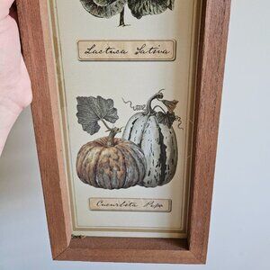 Framed wall art. Features botanical illustrations of vegetables, including tomatoes, artichokes, pumpkins and lettuce. Brown wooden frame. Perfect for kitchen, pantry or dining room. NEW. Dimensions are 28.2 x 6.2 in.