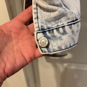 Chic light wash jean jacket. Features button front and chest pockets. Ideal for layering. Especially nice for tall people!