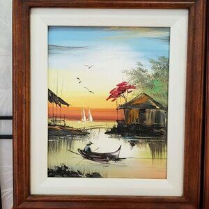 This set of 2 Asian "Fishing River And Landscape Scene" Oil Painting captures the tranquil beauty of an Asian fishing village in an expressive style. This set of two 8x10" paintings on canvas is framed and features a matted design for a sophisticated look. Handmade with oil painting technique, these original pieces bring a touch of Asian culture to any space. Perfect for art enthusiasts looking to adorn their walls with unique and evocative artwork.
