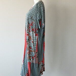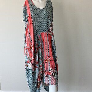 Beautiful aqua and coral Asian floral print pullover dress has scoop neckline, short sleeves, pockets and draped sides with asymmetrical hemline that skims and elongate the body. Fabric has stretch.