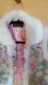 Elegant floral embroidered vest with faux fur trim. Features vibrant pink and green floral patterns on a cream background. Perfect for adding a touch of luxury to any outfit. Can be used for costume parties or events