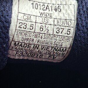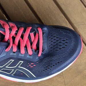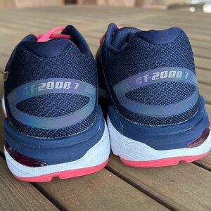 A used pair of Women’s size 6.5 Wide Asics GT-2000 7 Running Shoes without the box. The color pattern is Navy, Silver and Pink. Model 1012A146. The upper is in good condition, there are no holes or tears but there is some very minor stretching in the bunion area. The sole is in good condition but has some noticeable wear in the mid forefoot and outer heels as you can see in the pictures. Please be sure to look at all the pictures as they are an important part of this ad.
