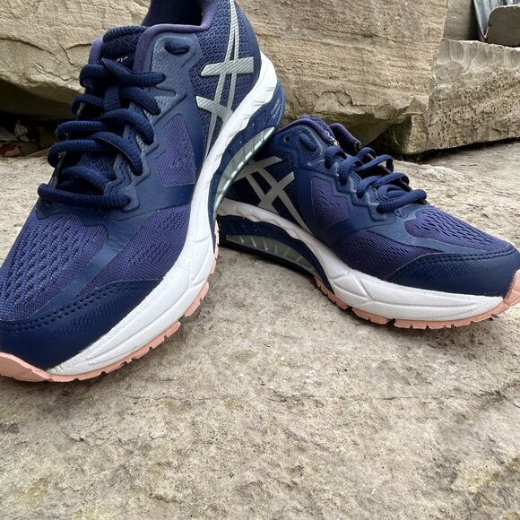 A lightly used pair of Women’s size 6 Asics Gel Foundation Running Shoes without the box. The color pattern is Indigo Blue, Silver and Seashell Pink. Model T864N (D). There are no tears or rips in the upper. The sole has very little wear as you can see in the pictures. The insoles are original but have not been used as I used my own orthotic insoles in each shoe.