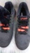 a pair of dark grey Asics athletic shoes with bright orange accents on the laces and a hint of orange on the sole. The shoes feature the distinctive Asics logo in a lighter grey or silver color on the side. The texture of the shoes appears to be a mesh-like material.