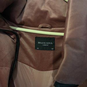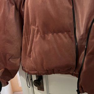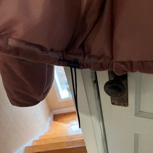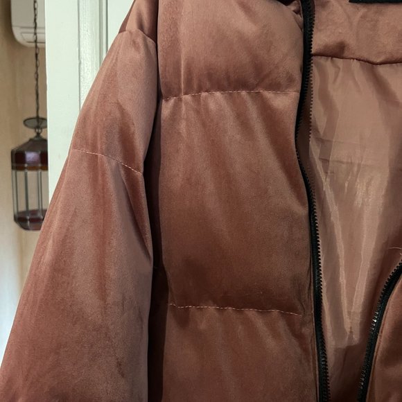 Great Condition. Blush pink velvet puffer coat. Has pockets and an elastic at the bottom to adjust the waist. No hood, but a thick colour.