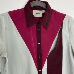In good condition gently worn. 100% polyester but feel like silk. Fun abstract colorblock design. Spares buttons on the inside. Measure lay flat: shoulder 15'' bust 20'' length 27'' sleeve length 25''.